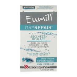 Eumill DRYREPAIR é uma solução estéril para uso oftálmico baseada em ácido hialurônico reticulado com ureia, para aumentar e melhorar as propriedades mecânicas do ácido hialurônico, tornando-o capaz de resistir à degradação por hialuronidases por muito tempo.