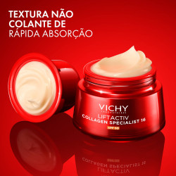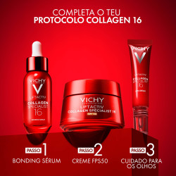 Vichy Liftactiv Collagen Specialist 16 Creme FPS 50, com a nova tecnologia exclusiva Co-Bonding Tecnologia Co-Bonding [Ramnose+Péptidos+Maitake], para potenciar e unir todas as famílias de colagénios. Agora com FPS 50 para uma proteção contra a exposição solar diária. Esta fórmula corrige 16 sinais de envelhecimento, para uma pele visivelmente mais jovem: rugas, linhas finas, firmeza, volume, flacidez, suavidade, textura cutânea, tonicidade, força da pele, renovação da superfície celular da pele, luminosidade, pele macia, elasticidade, hidratação, vitalidade e homogeneidade.