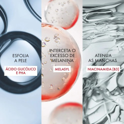 Formulado com 3 % de ingredientes esfoliantes (ácido glicólico e PHA) e Melasyl. Estes ingredientes esfoliam suavemente e refinam a superfície da pele. O Melasyl, um ingrediente ativo desenvolvido após 18 anos de investigação, interceta o excesso de melanina antes que esta deixe marcas na pele.